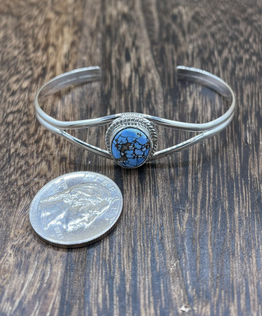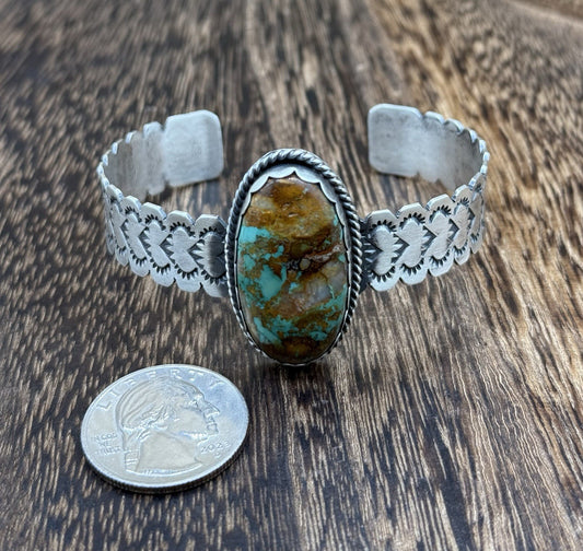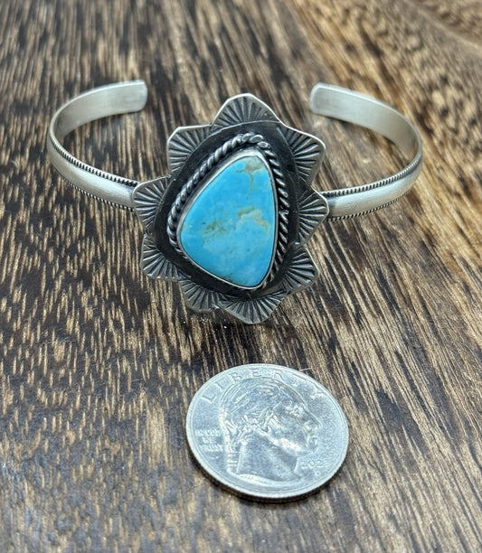 Native Navajo Handmade Sterling Silver Kingman Turquoise Cuff Stamped Bracelet
