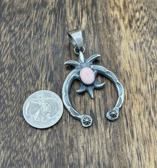 Native American Navajo Handmade Sterling Silver Old Look Pink Conch Naja Pendant