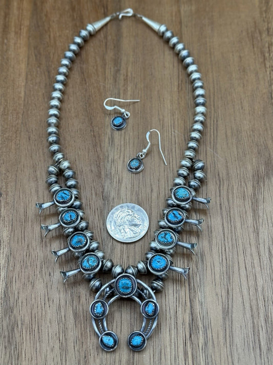 Navajo Handmade Sterling Silver Turquoise Shadowbox Squash Blossom Necklace 17”