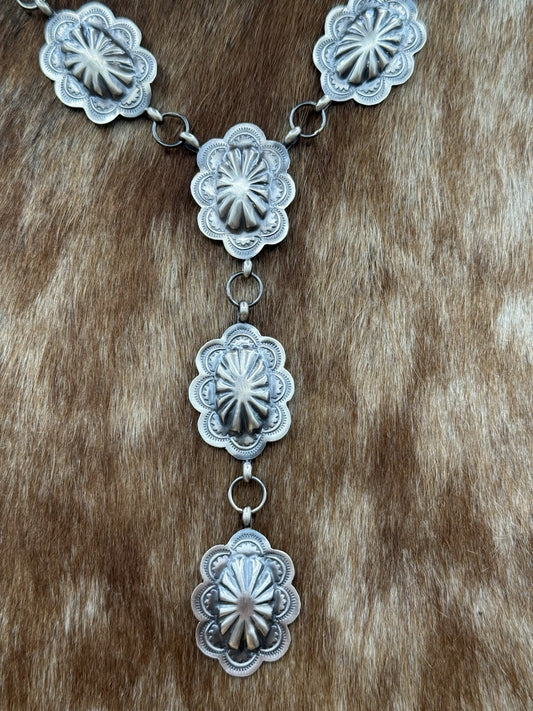 Navajo Handmade Sterling Silver Stamped Concho Old Look Lariat Necklace Set 24”