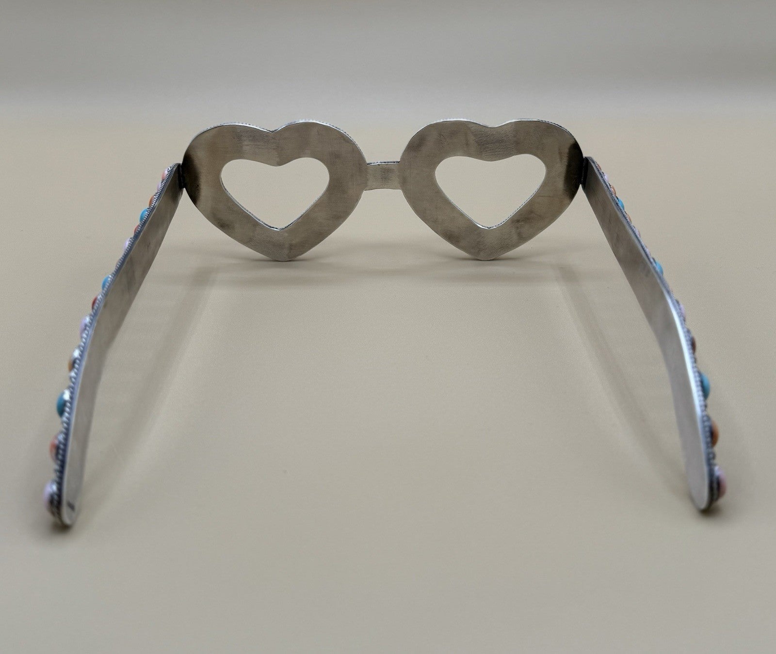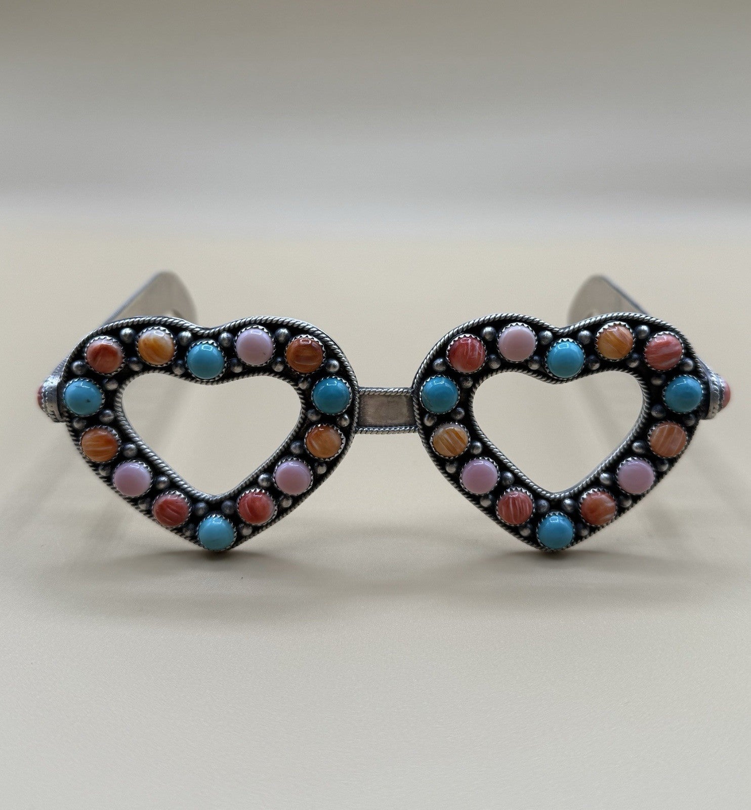 Introducing the first ever pair of handmade sterling silver glasses featuring a beautiful blend of blue, pink, orange, and red stones such as turquoise, spiny oyster, and pink conch. The glasses are designed by Navajo artist Tricia Smith.