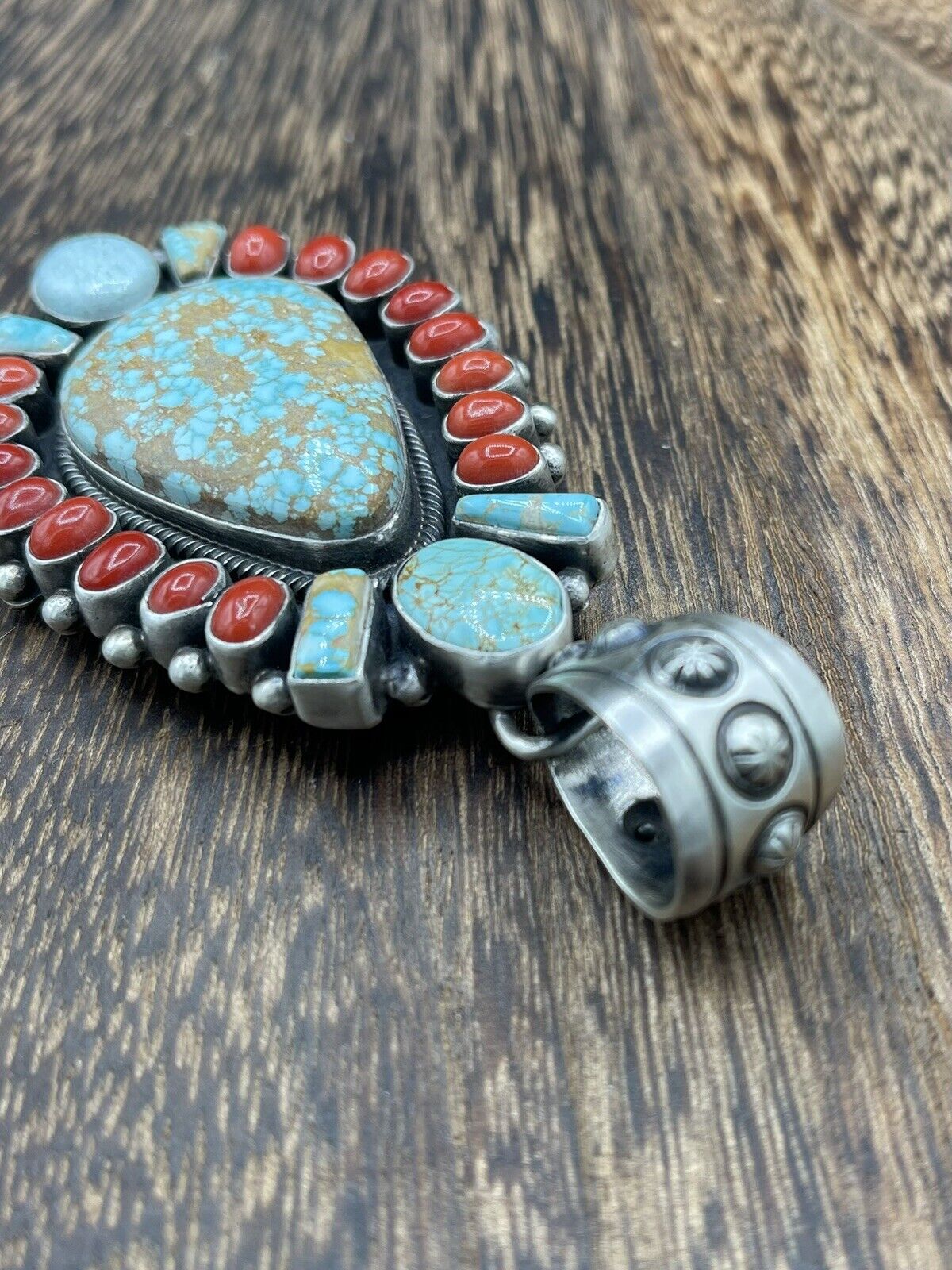 This beautiful pendant is a true work of art. Handmade by Darrin Livingston, a Native American artisan. The pendant is made of 925 sterling silver and adorned with stunning natural red coral (middle outer) , golden hills turquoise (top amd bottom) and Royston turquoise (center).