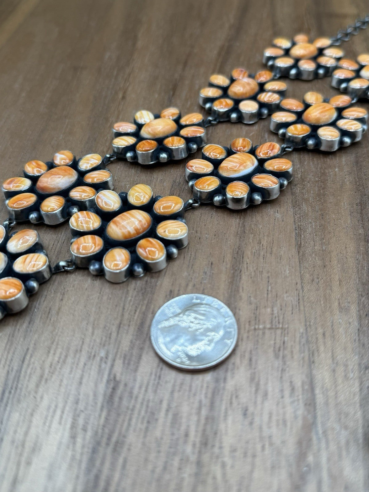 Navajo Handmade Silver Orange Spiny Oyster Cluster Lariat Dangle Necklace 24”