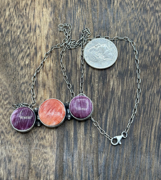Navajo Handmade Sterling Silver Multicolor Spiny Oyster Cluster Bar Necklace 18”