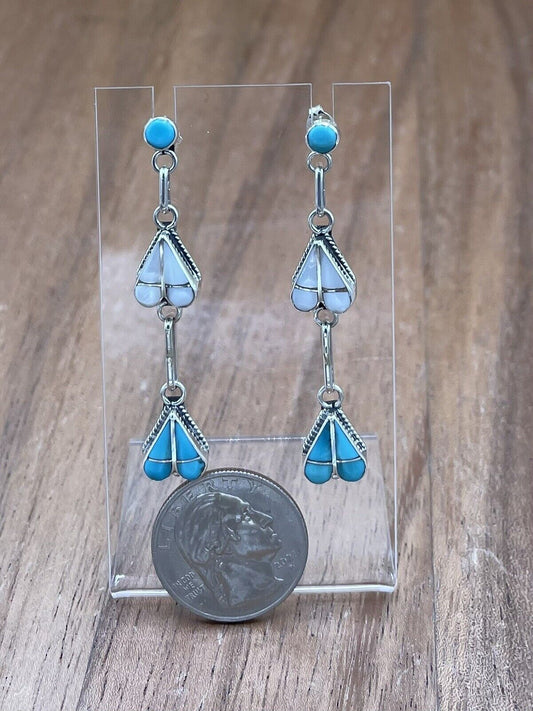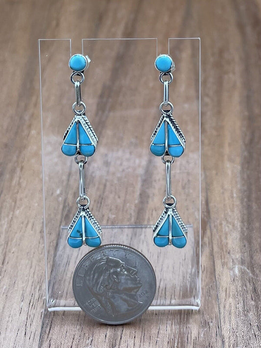 Native American Zuni Handmade Silver Inlay Turquoise Post Dangle Drop Earrings