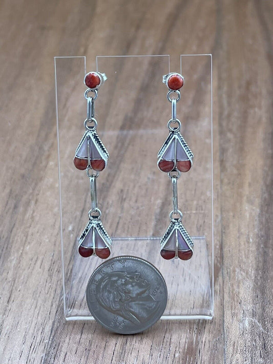 Native American Zuni Handmade Silver Inlay Spiny Post Dangle Drop Earrings