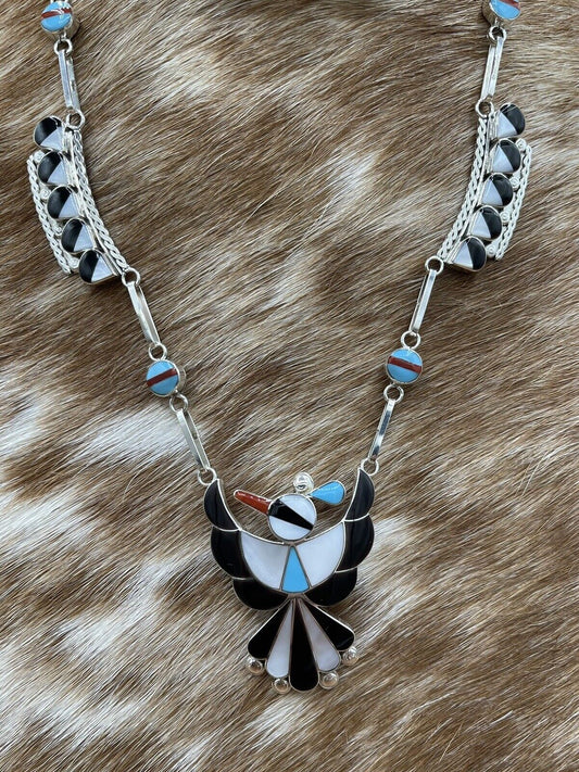Native American Zuni handmade Silver Multi-stone Inlay Thunderbird Necklace 22”