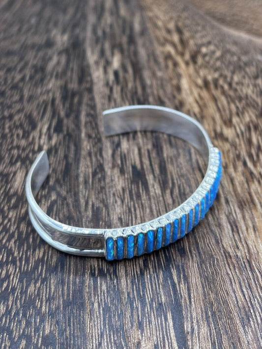 Native American Zuni Handmade Sterling Silver Blue Opal Stacker Cuff Bracelet