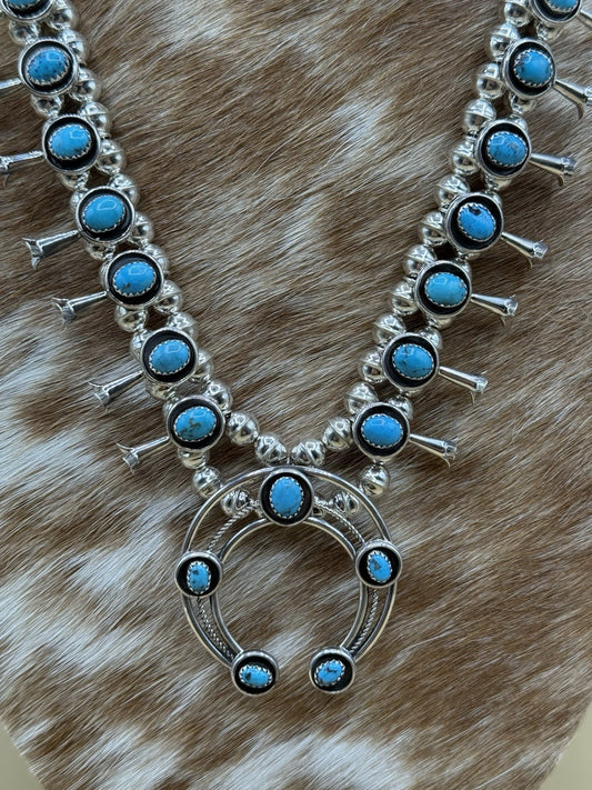 Native American Navajo Handmade Silver Kingman Turquoise Squash Blossom Set 18”