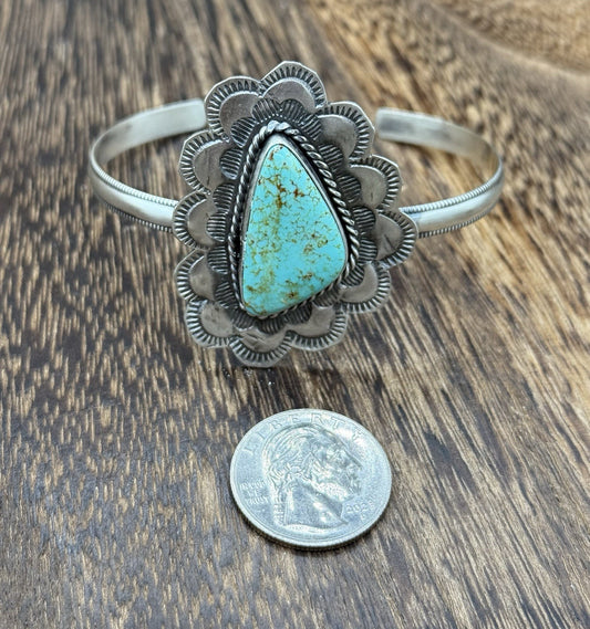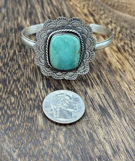 Native Navajo Handmade Sterling Silver Kingman Turquoise Cuff Stamped Bracelet