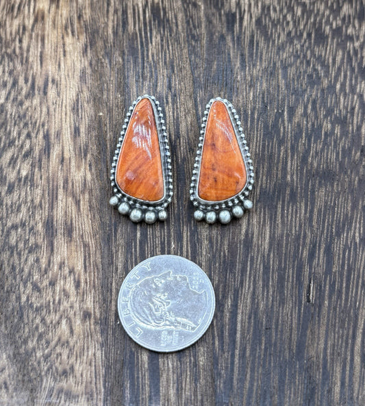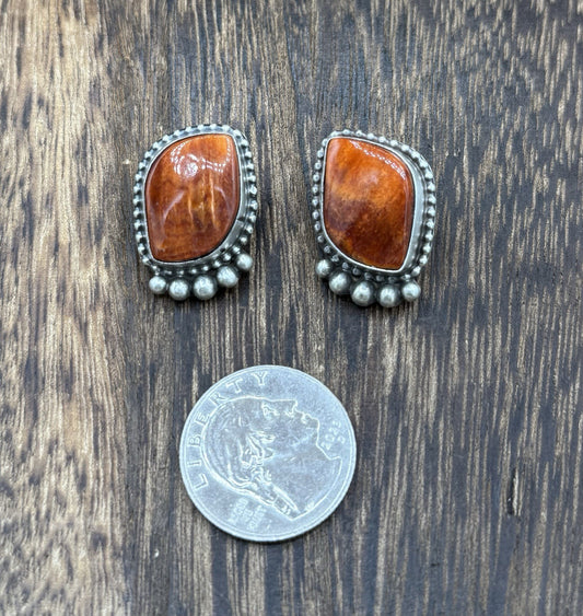 Native Navajo Handmade Sterling Silver Orange Spiny Oyster Post Stud Earrings