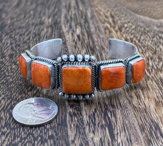 Native Navajo Handmade Sterling Silver Orange Spiny Oyster Shell Cuff Bracelet