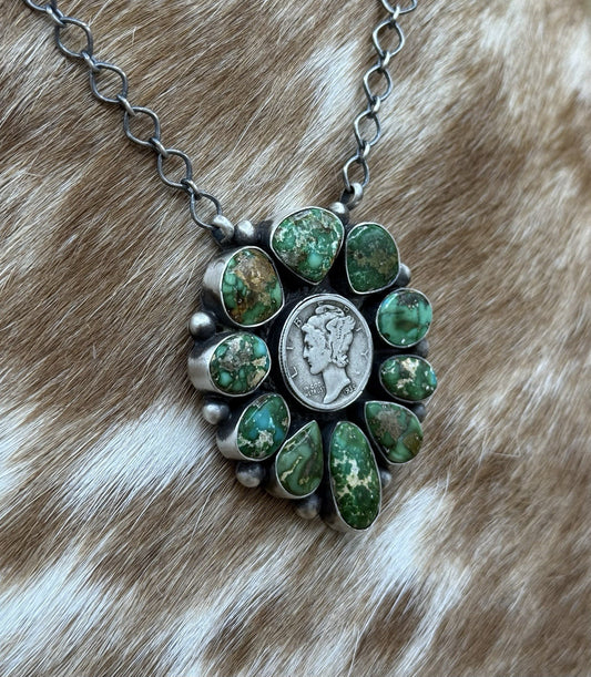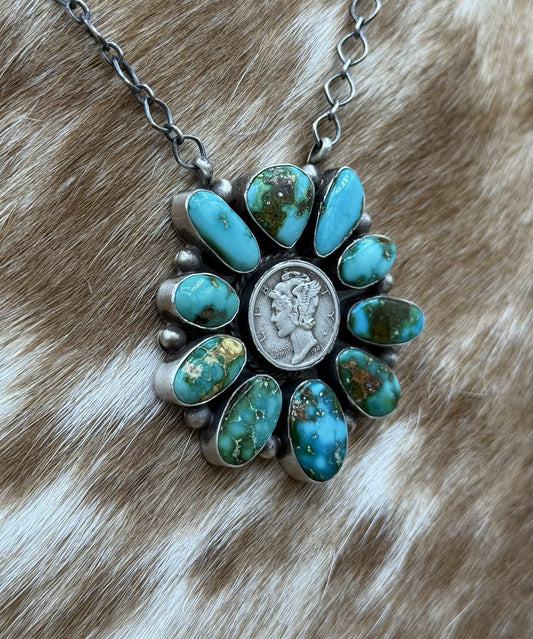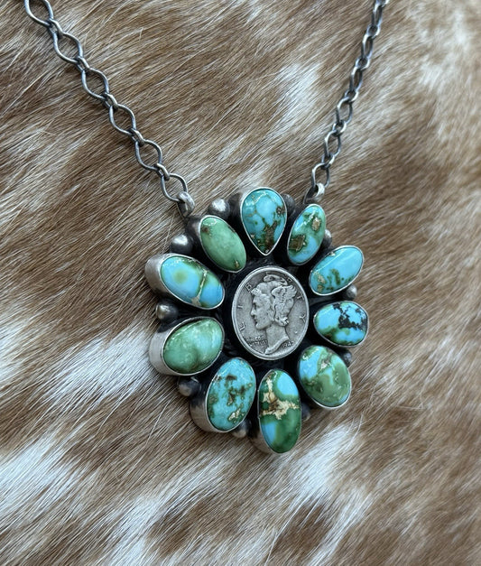 Navajo Handmade Silver Sonoran Gold Turquoise Liberty Coin Cluster Necklace 18”Regular price $500.00 USDRegular priceUnit price / per-