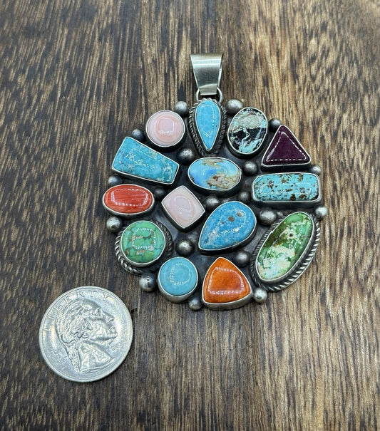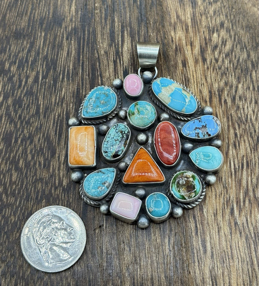 Navajo Handmade Sterling Silver Mixed Turquoise Spiny Large Cluster PendantRegular price $500.00 USDRegular priceUnit price / per-
