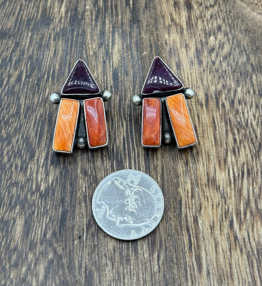 Navajo Handmade Sterling Silver Multi Spiny Oyster Shell Post Cluster Earrings