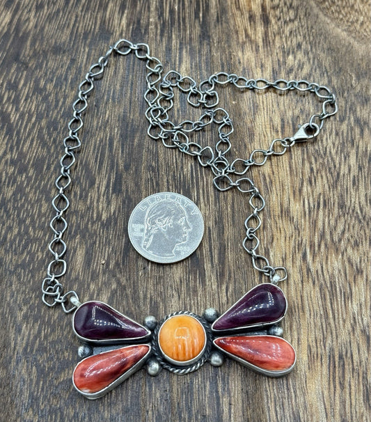Navajo Handmade Sterling Silver Multi Spiny Oyster Shell Cluster Lariat Necklace