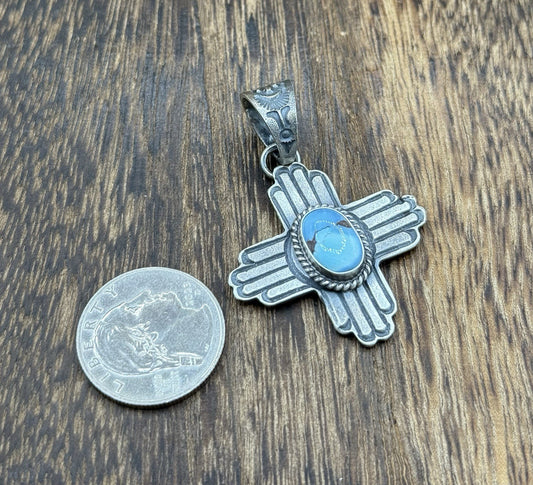 Navajo Handmade Sterling Silver Old Look Golden Hills Turquoise Zia Pendant
