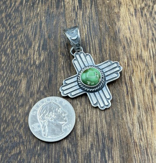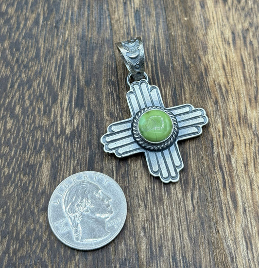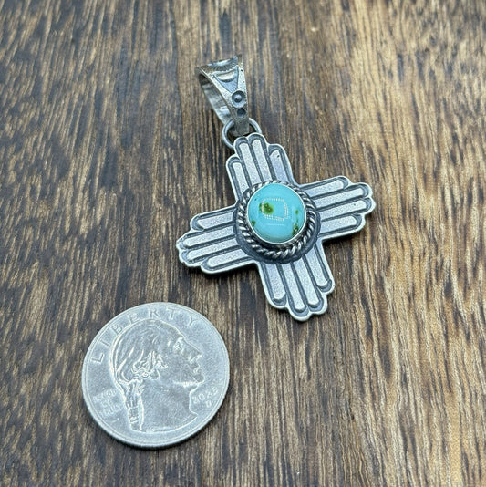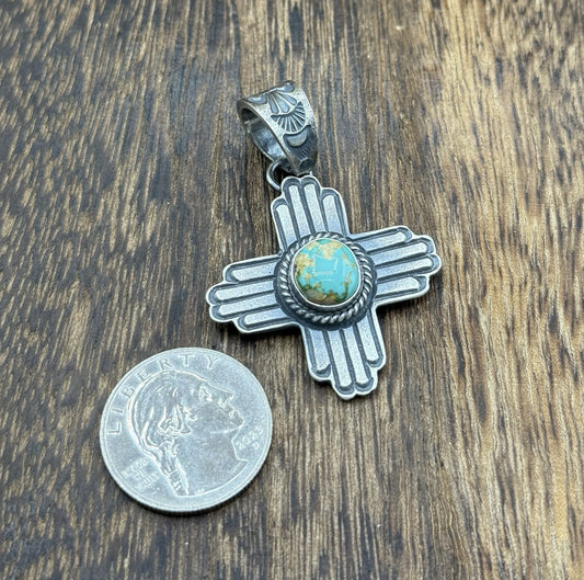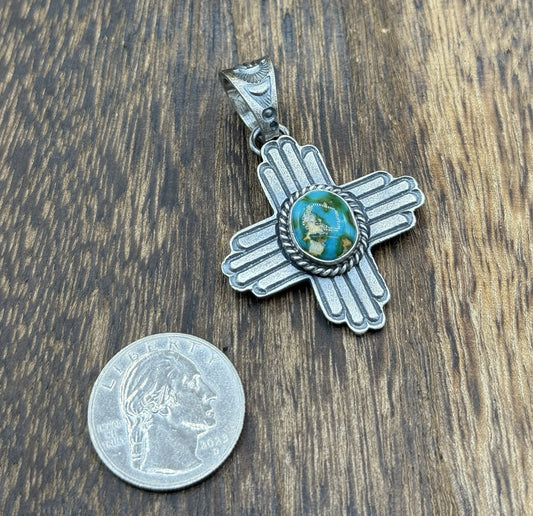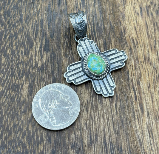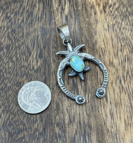 Navajo Handmade Sterling Silver Old Look Sonoran Gold Turquoise Zia Pendant