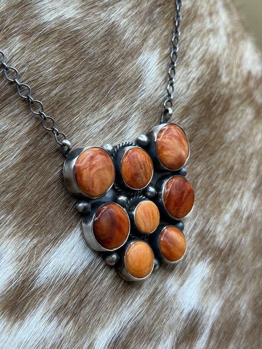 Navajo Handmade Sterling Silver Orange Spiny Oyster Cluster Bar Necklace 18”