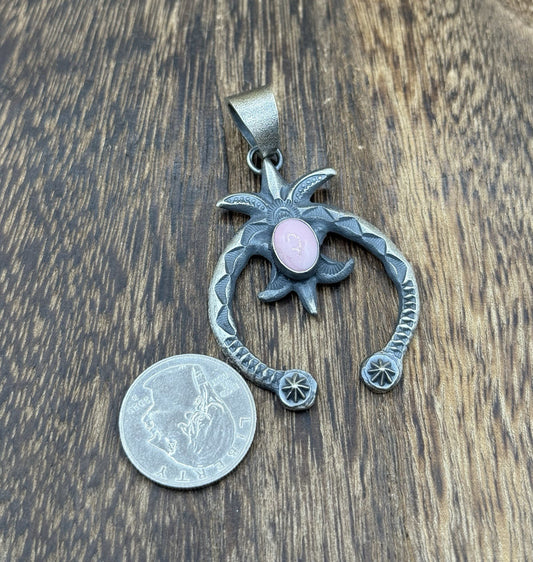 Native American Navajo Handmade Sterling Silver Old Look Pink Conch Naja Pendant