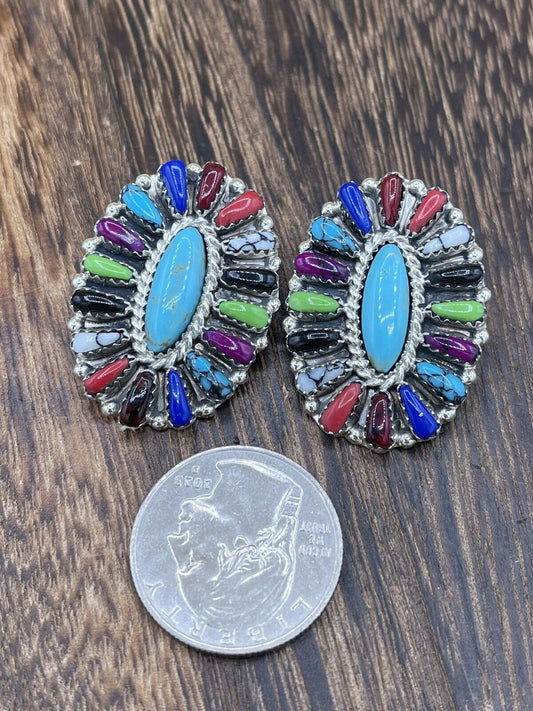 Native American Navajo Handmade Sterling Silver Multicolor Cluster Stud Earrings
