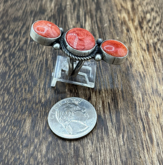 Navajo Handmade Sterling Silver Red Spiny Oyster Shell Cluster Ring Size 7