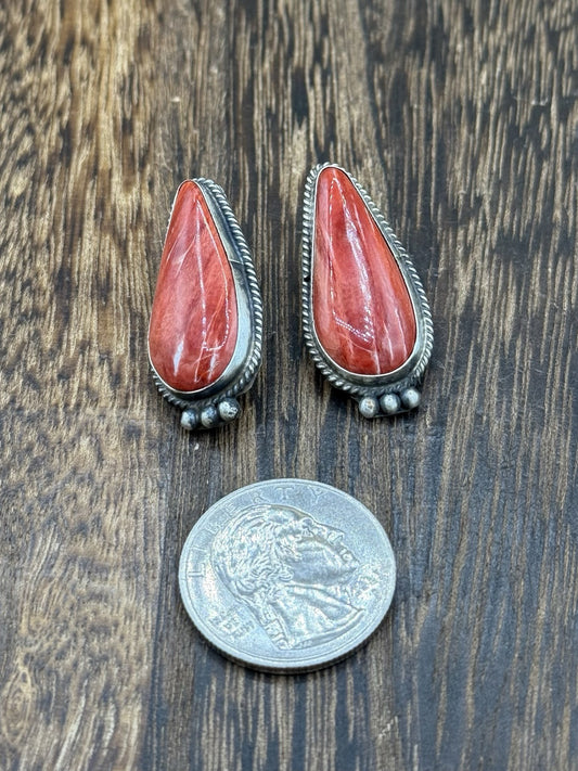 Navajo Handmade Sterling Silver Red Spiny Oyster Post Earrings By Byron Begay