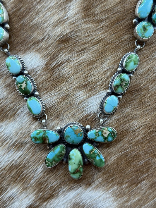 Navajo Handmade Sterling Silver Sonoran Gold Turquoise Cluster Necklace Set 20”