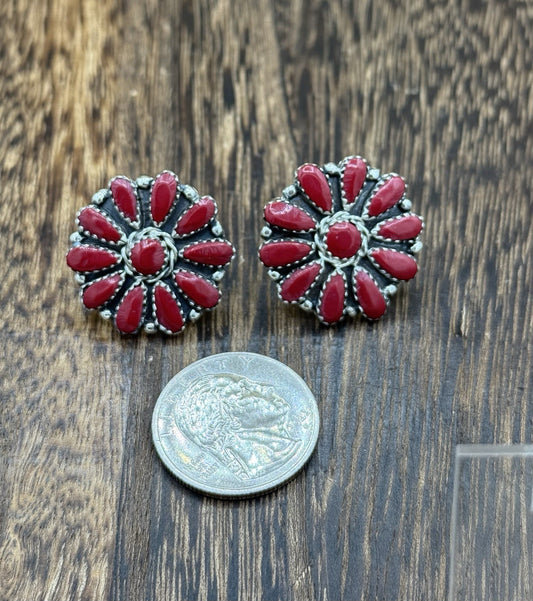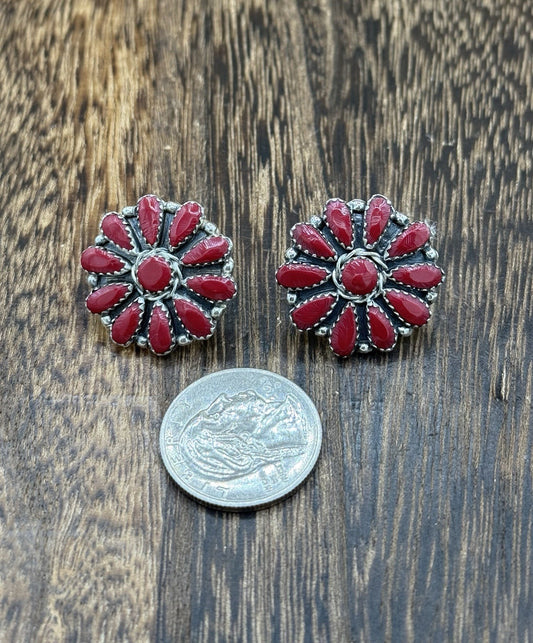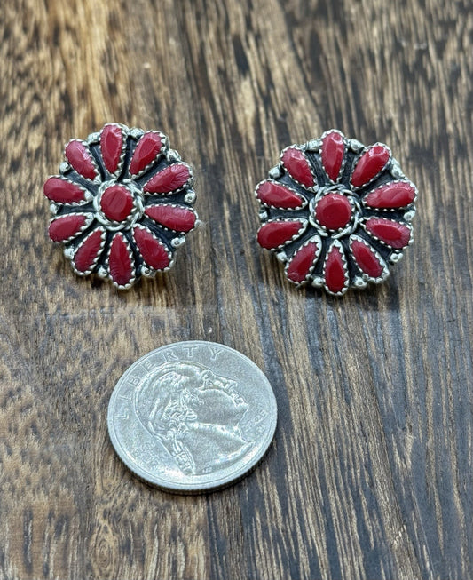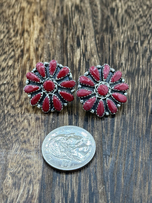 Native American Navajo Handmade Sterling Silver Red Coral Cluster Stud Earrings