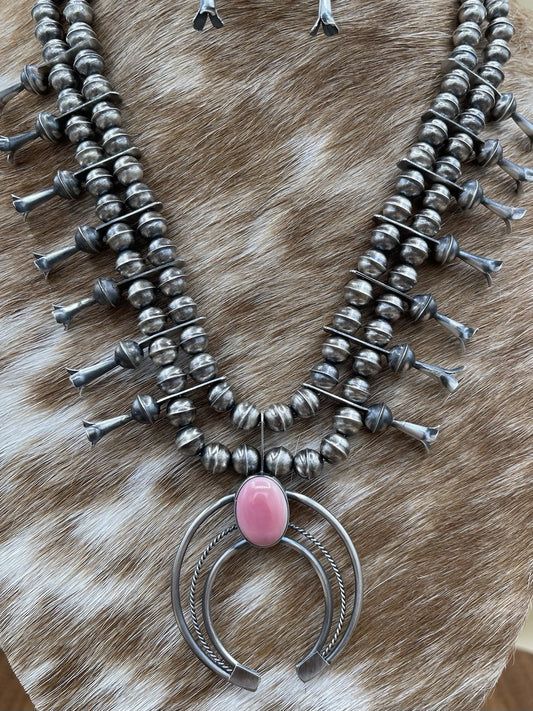 Native American Navajo Handmade Sterling Silver Pink Conch Squash Blossom 18”