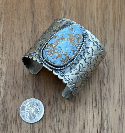 Navajo Handmade Sterling Silver Golden Hills Turquoise Stamped Cuff Bracelet