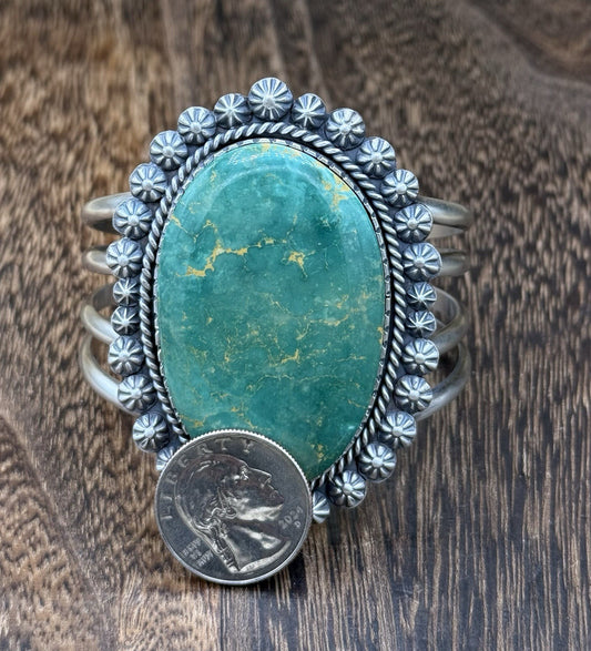 Navajo Handmade Sterling Silver Emerald Valley Turquoise Old look Cast Bracelet