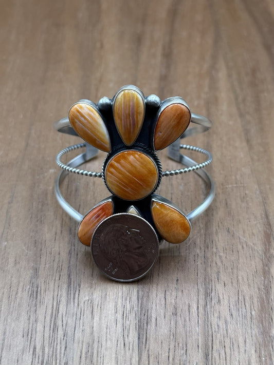Navajo Handmade Sterling Silver Orange Spiny Oyster Cluster Cuff Bracelet