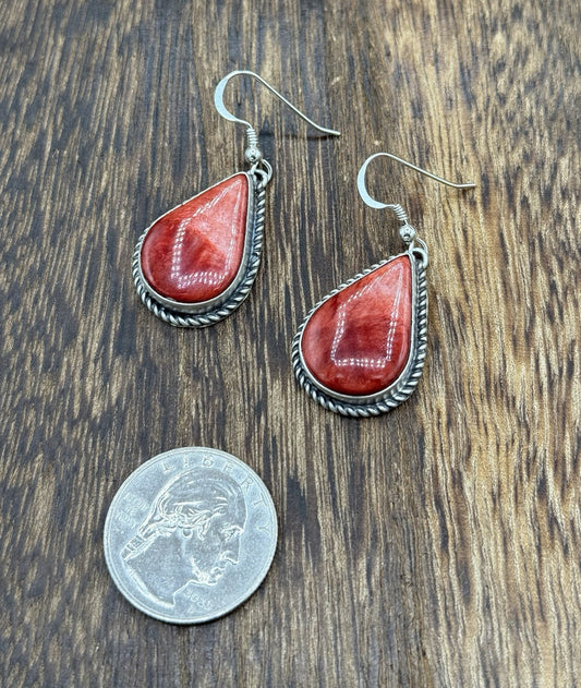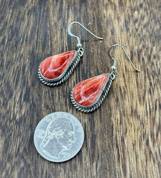 Native Navajo Handmade Sterling Silver Red Spiny Oyster Shell Dangle Earrings