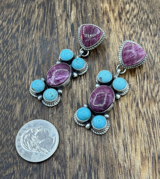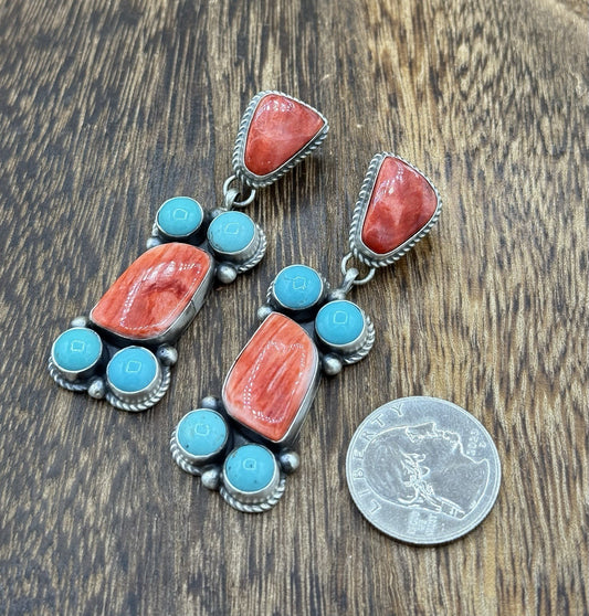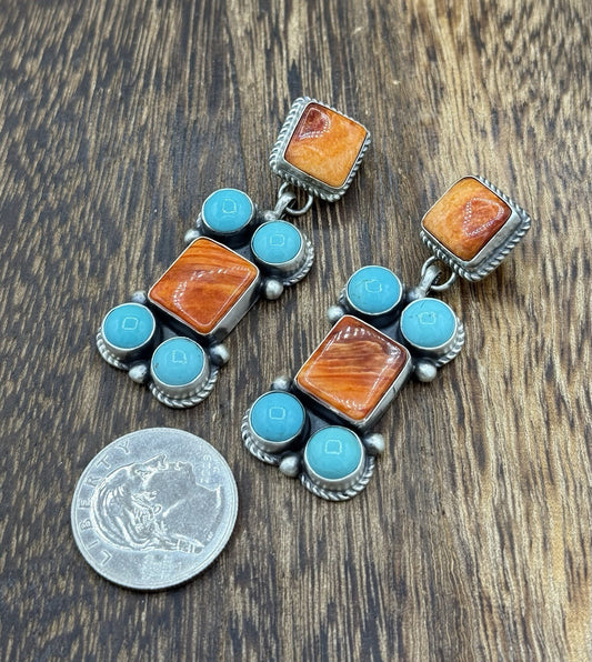 Navajo Handmade Sterling Silver Turquoise & Spiny Oyster Post Dangle Earrings