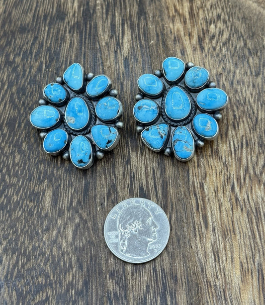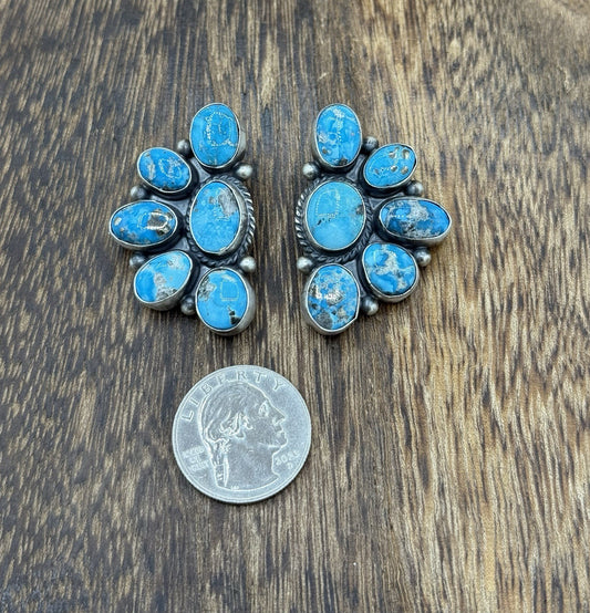 Navajo Handmade Sterling Silver Blue Ridge Turquoise Half Cluster Large Earrings