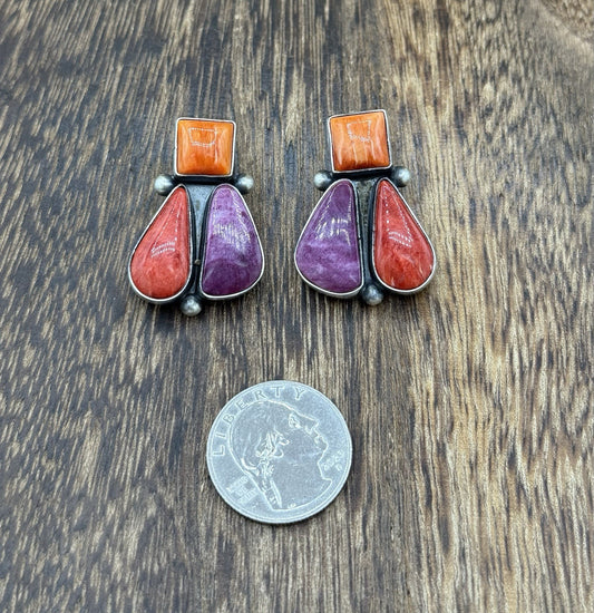 Navajo Handmade Sterling Silver Multi Color Spiny Oyster Shell Cluster Earrings