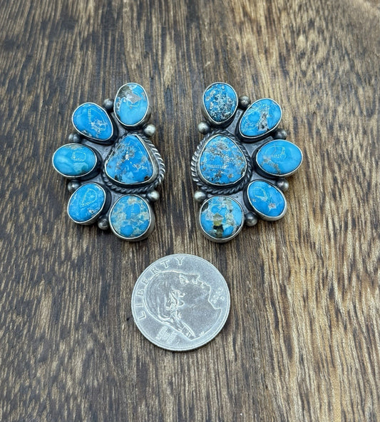 Navajo Handmade Sterling Silver Blue Ridge Turquoise Cluster Post Large Earrings