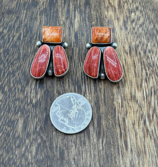 Navajo Handmade Sterling Silver Orange Spiny Oyster Shell Post Cluster Earrings