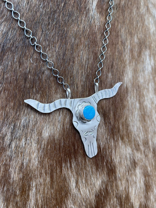 Navajo Handmade Sterling Silver Kingman Turquoise Longhorn Necklace By Betta Lee