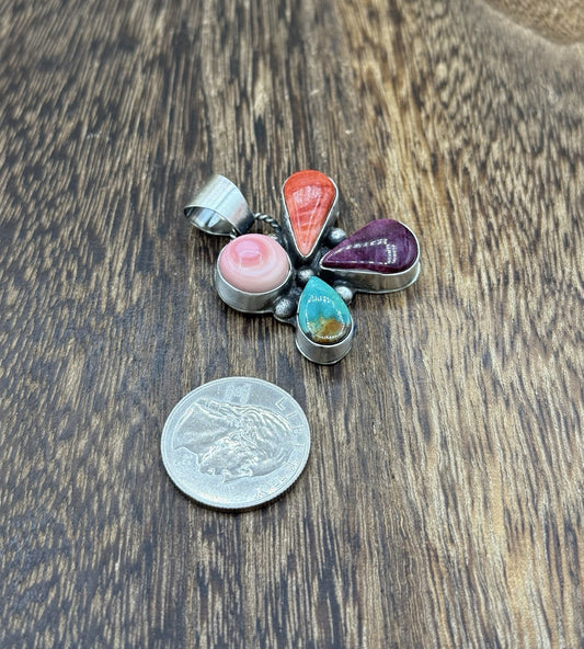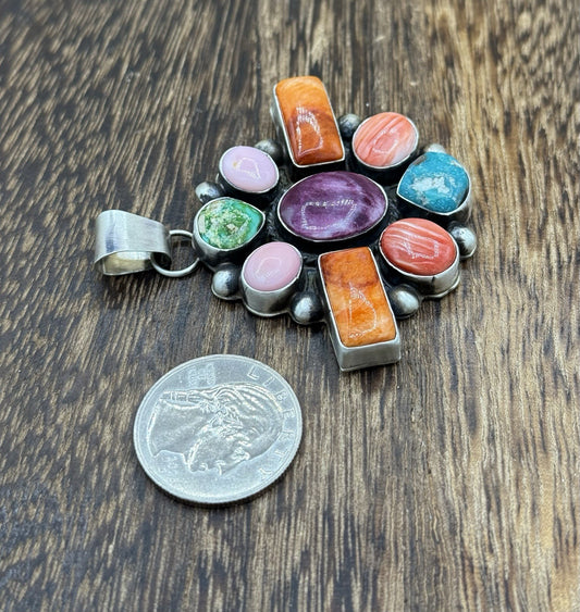 Navajo Handmade Sterling Silver Multi Color Turquoise Spiny Cluster Pendant