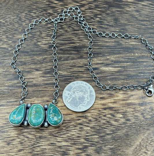 Navajo Handmade Sterling Silver Kingman Turquoise Cluster Bar Necklace 18”