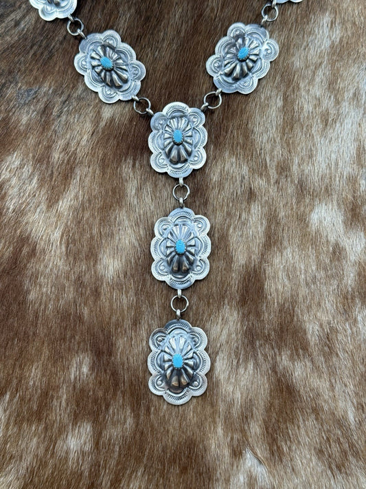 Navajo Handmade Sterling Silver Stamped Concho Turquoise Lariat Necklace Set 18”