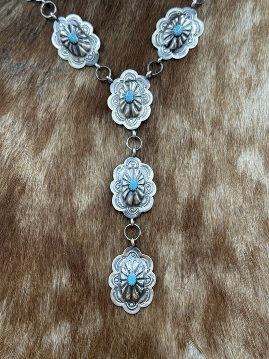 Navajo Handmade Sterling Silver Stamped Concho Turquoise Lariat Necklace Set 20”