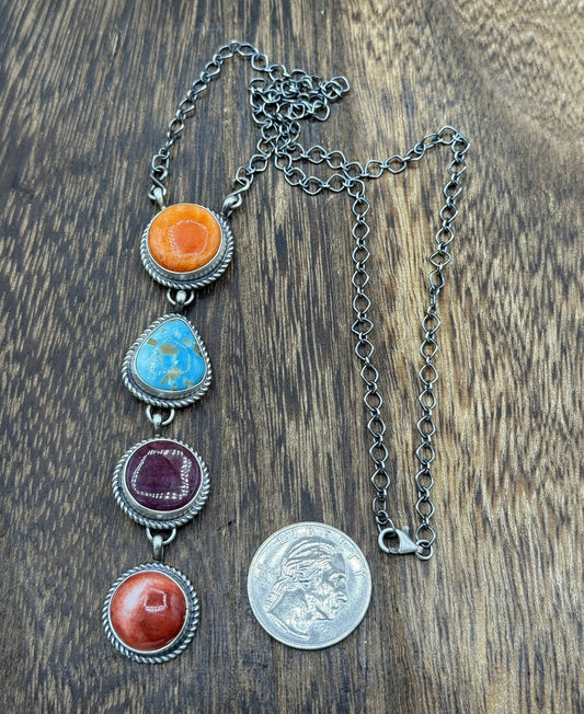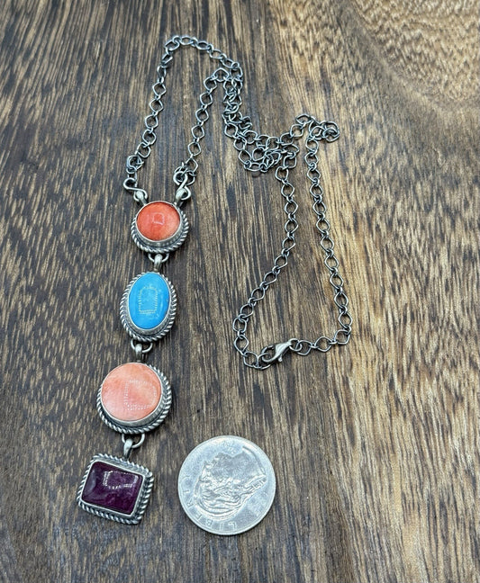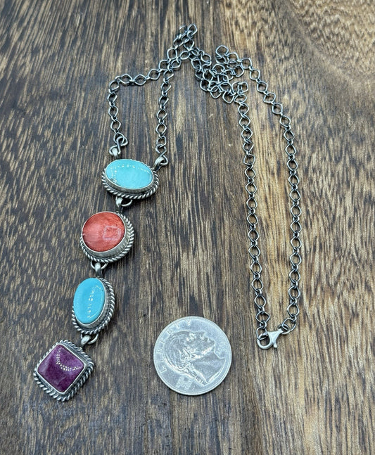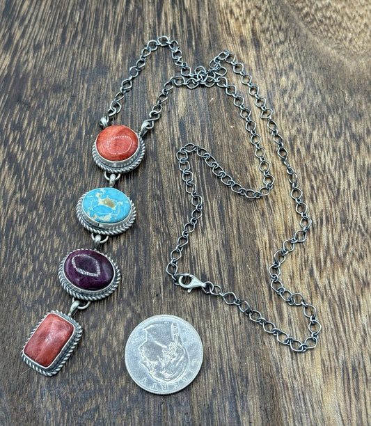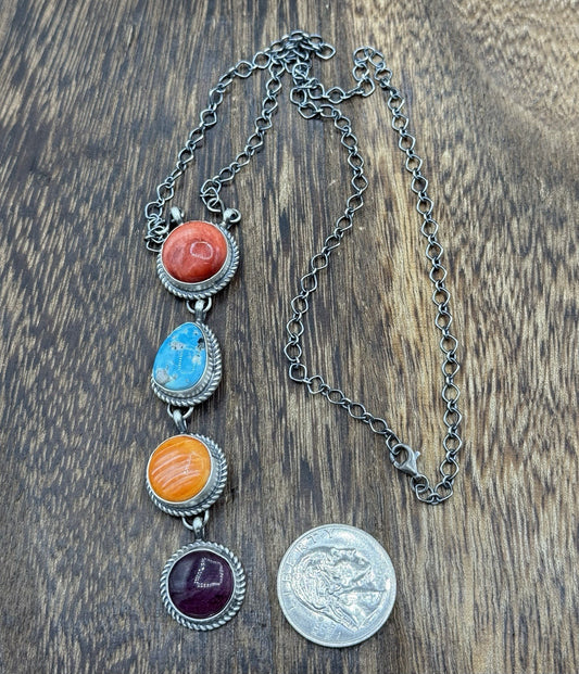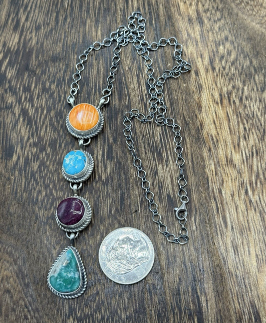 Navajo Handmade Sterling Silver Multi Color Mixed Stone Lariat Necklace 18”