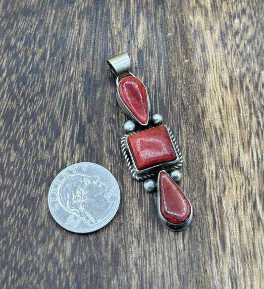 Navajo Handmade Sterling Silver Red Spiny Oyster Shell Cluster Drop Pendant