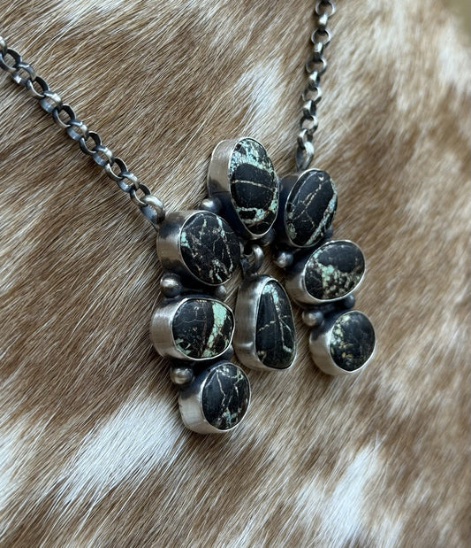 Navajo Handmade Sterling Silver Blackjack Turquoise Cluster Naja Necklace 18”