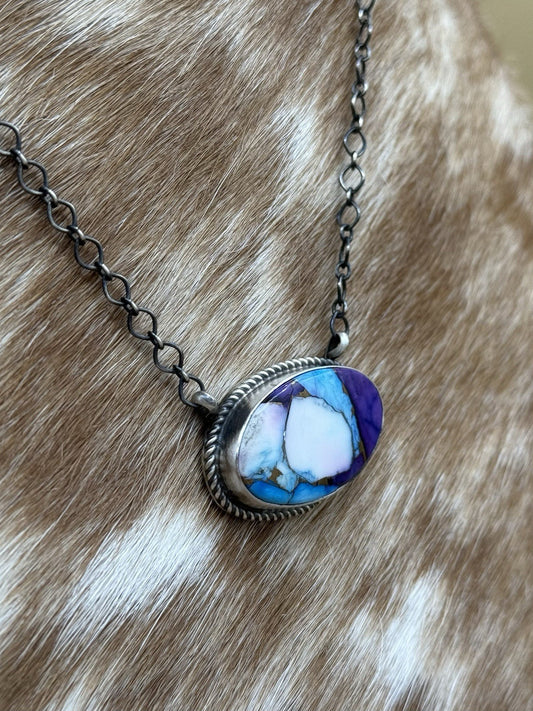 Navajo Handmade Sterling Silver Purple Spiny Oyster Cluster Bar Necklace 18”