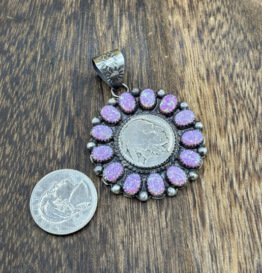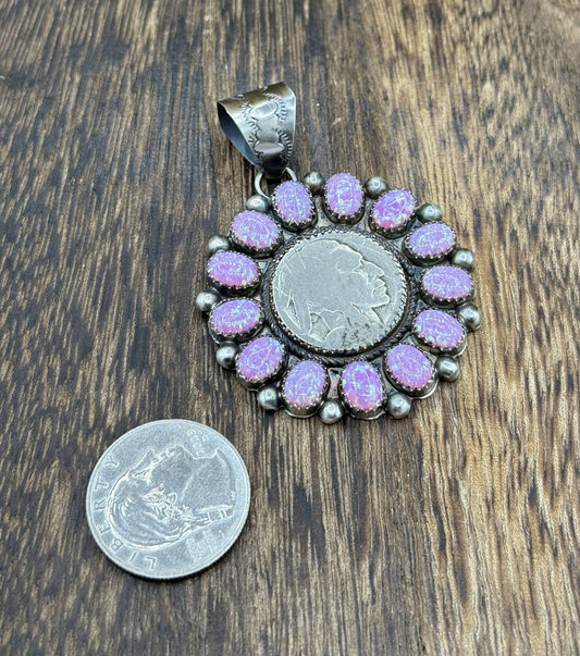 Navajo Handmade Sterling Silver Pink Fire Opal Cluster Buffalo Coin Pendant