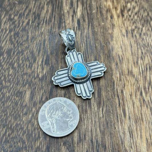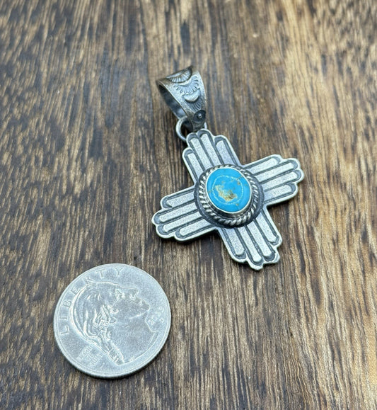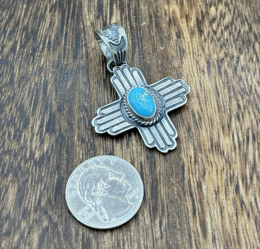 Navajo Handmade Sterling Silver Old Look Kingman Turquoise Zia Pendant Kevin B.